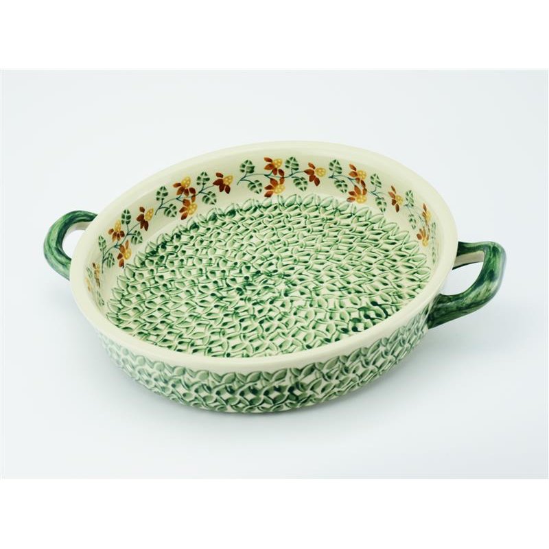 Die runde Auflaufform aus Bunzlauer Ton ist zum Gratinieren und Überbacken optimal. In der Form wird der Teig gleichmäßig durchgebacken und von allen Seiten goldbraun und knusprig. Die praktischen Seitengriffe erleichtern die Handhabung.