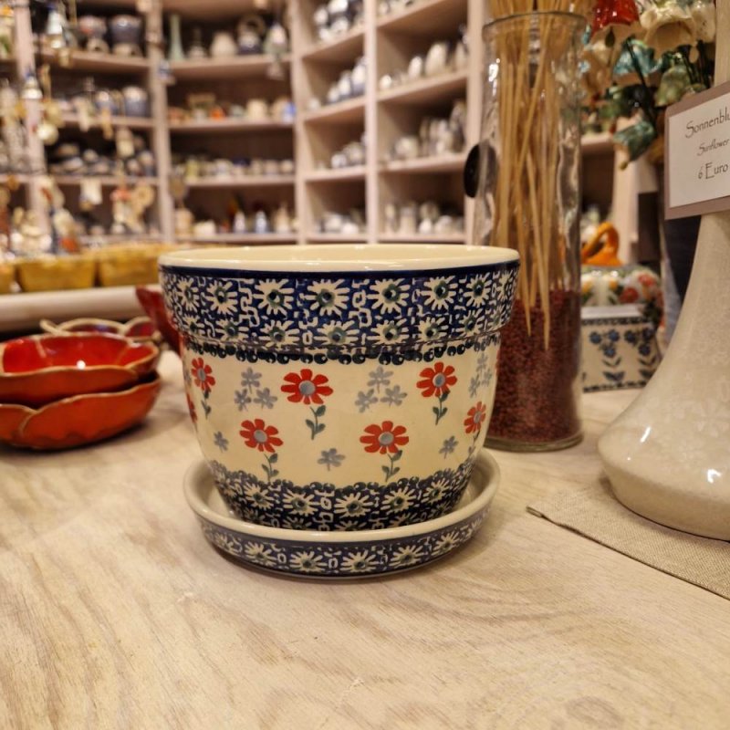 Für drinnen und draußen geeignet. Blumentopf mit Bodenloch und passendem Untersetzer. Ein klassischer, runder Pflanzkübel aus Bunzlauer Keramik ? zeitlos und praktisch.