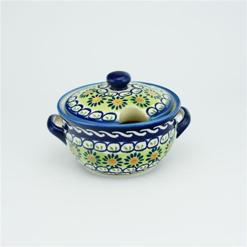 Kleine Dose mit Löffelaussparung. Hervorragend eignet sich dieser kleine Behälter für Ihre hausgemachten Konfitüren.