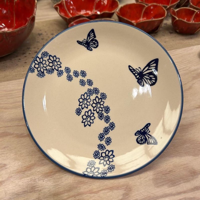 Ein großer Kuchenteller, der auch als ein kleiner Essteller dienen kann.