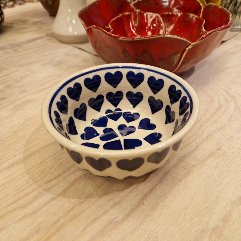 Diese mittlere Schüssel (O15 cm) ist außen in ihrer Form dezent mit Wellen verziert. Ihre schöne Innenbemalung macht sie noch interessanter.