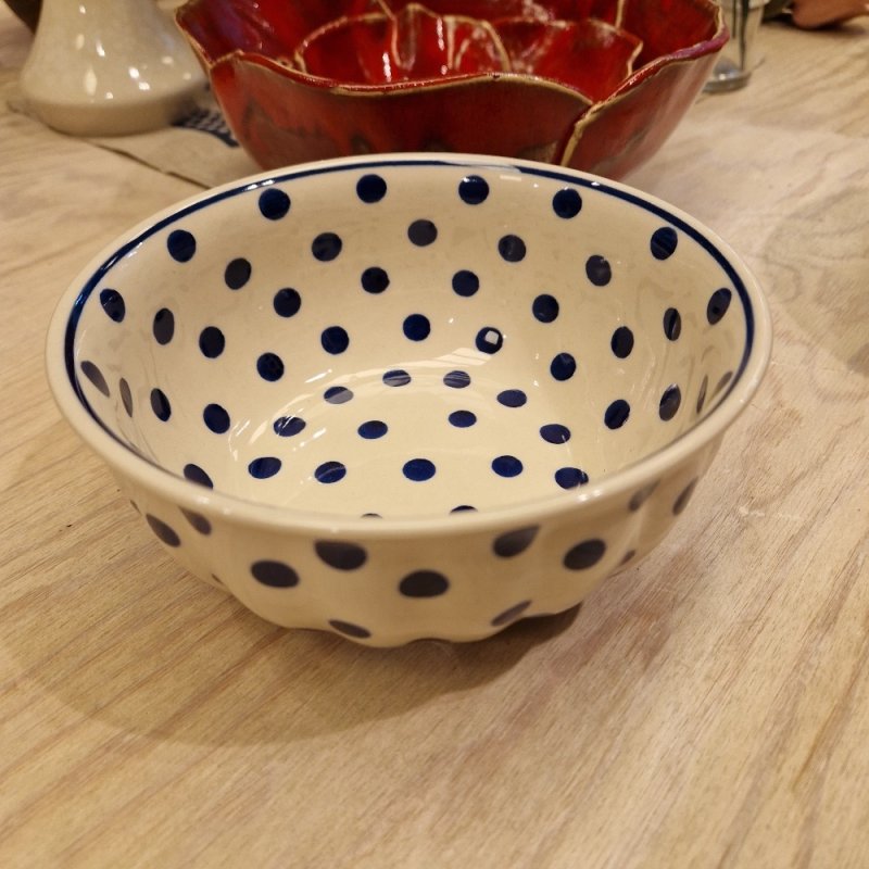 Aus der Reihe der mittleren Schüsseln ist diese vielseitig einsetzbare Schüssel. Diese mittlere Schüssel (O18 cm) ist außen in ihrer Form dezent mit Wellen verziert.Ihre schöne Innenbemalung macht sie noch interessanter. Resümee: eine haltbare und vielseitig einsetzbare, hochwertige Schüssel, die auch auf dem Tisch ein Hingucker ist.